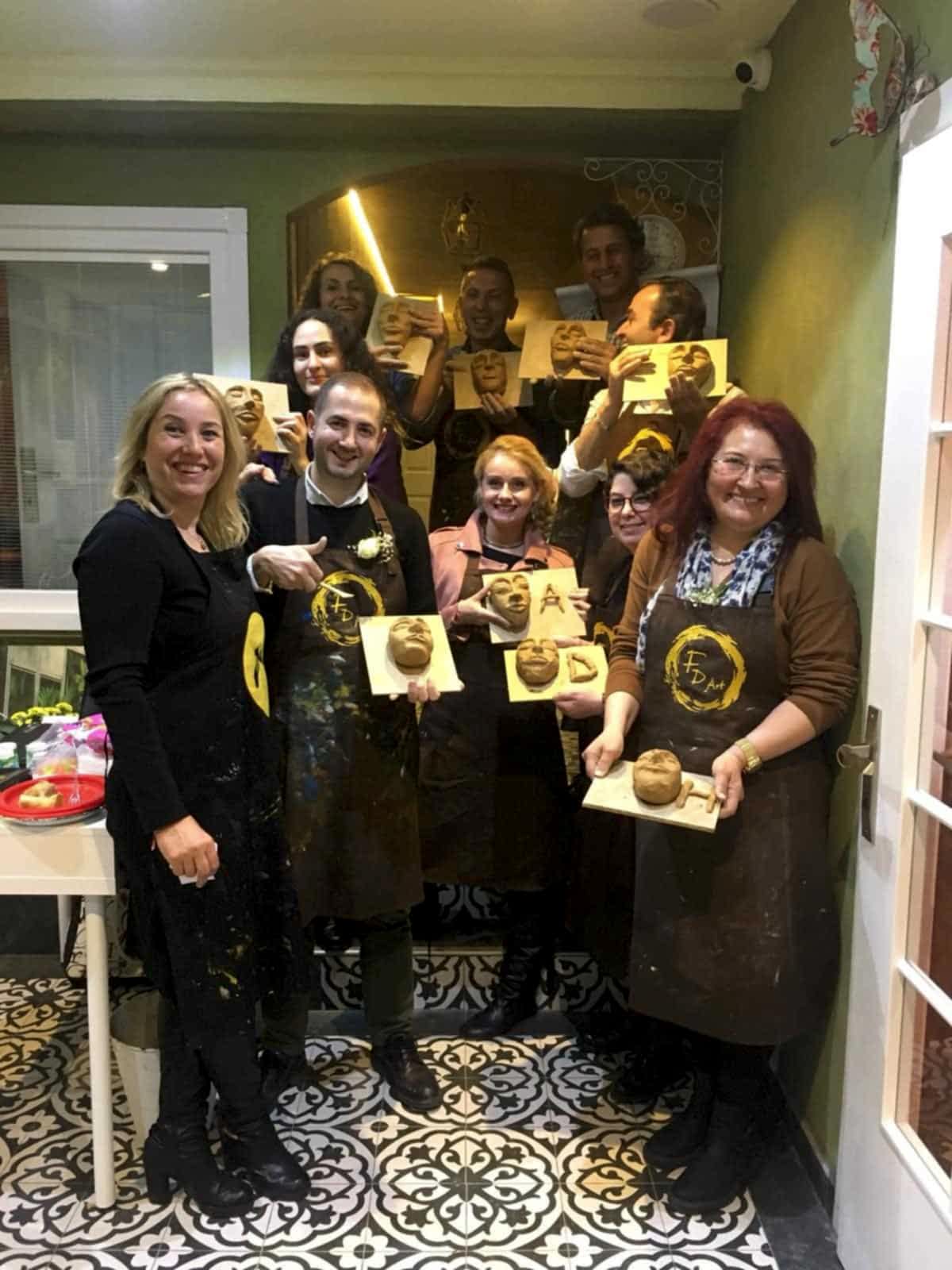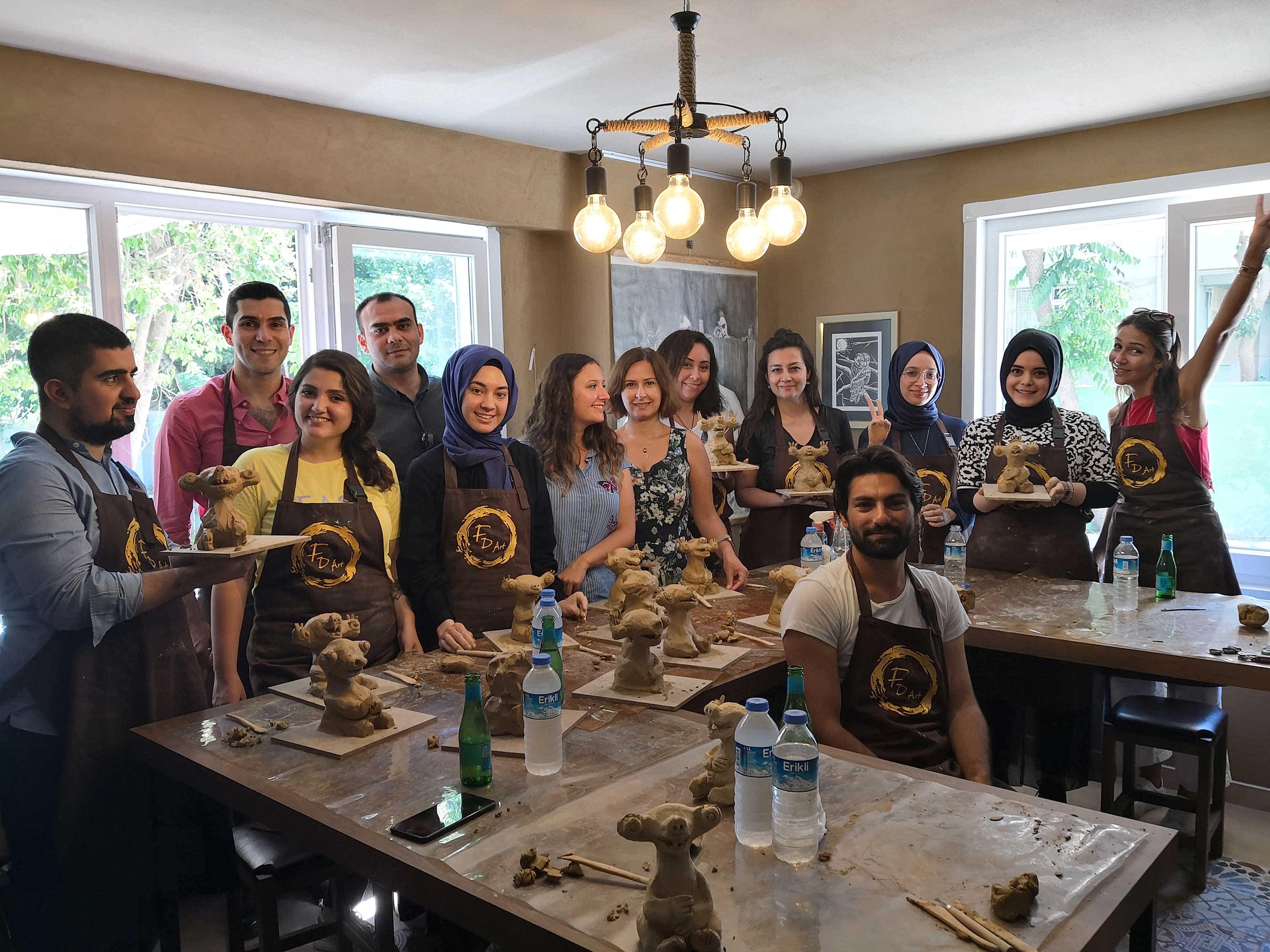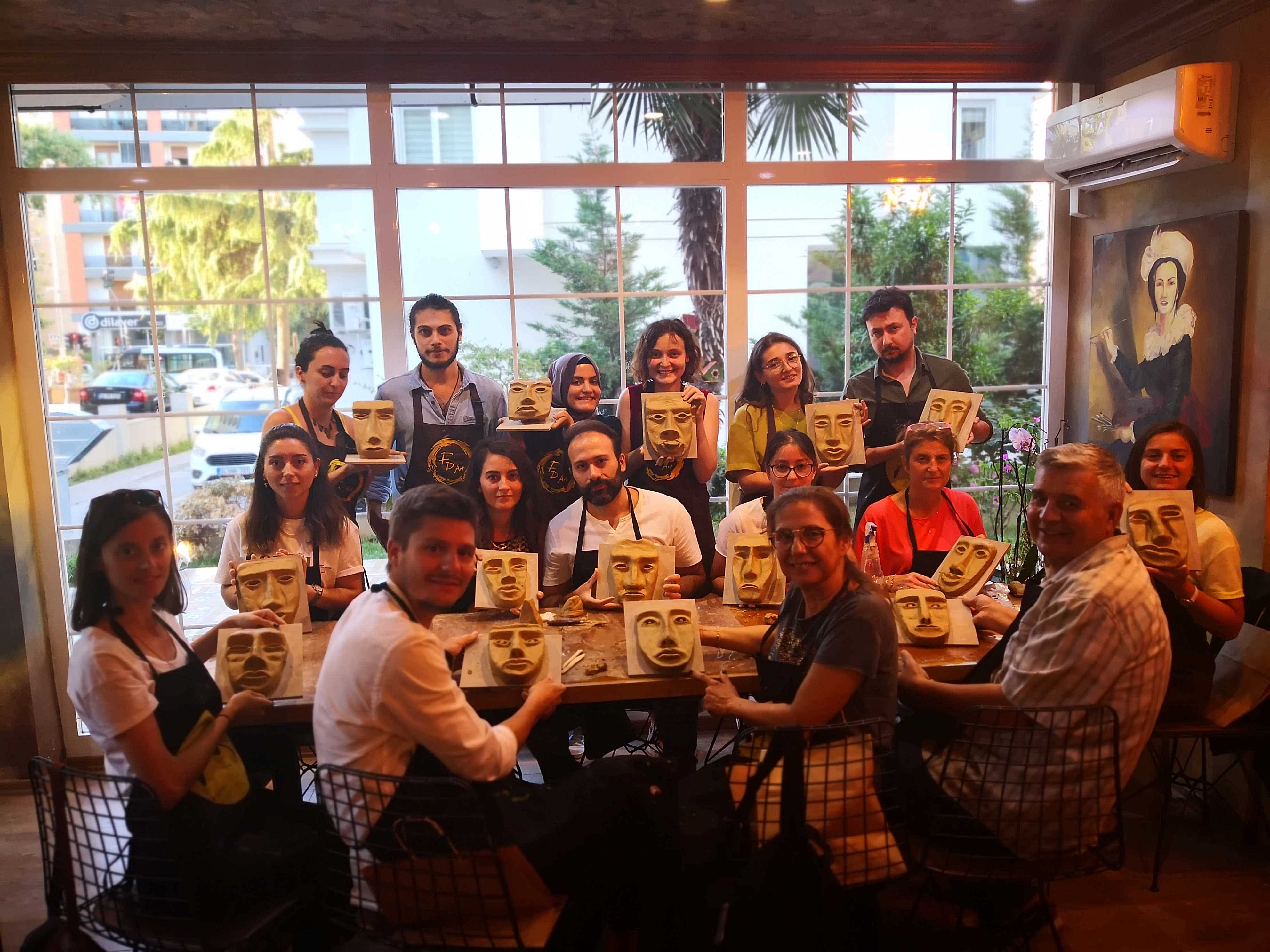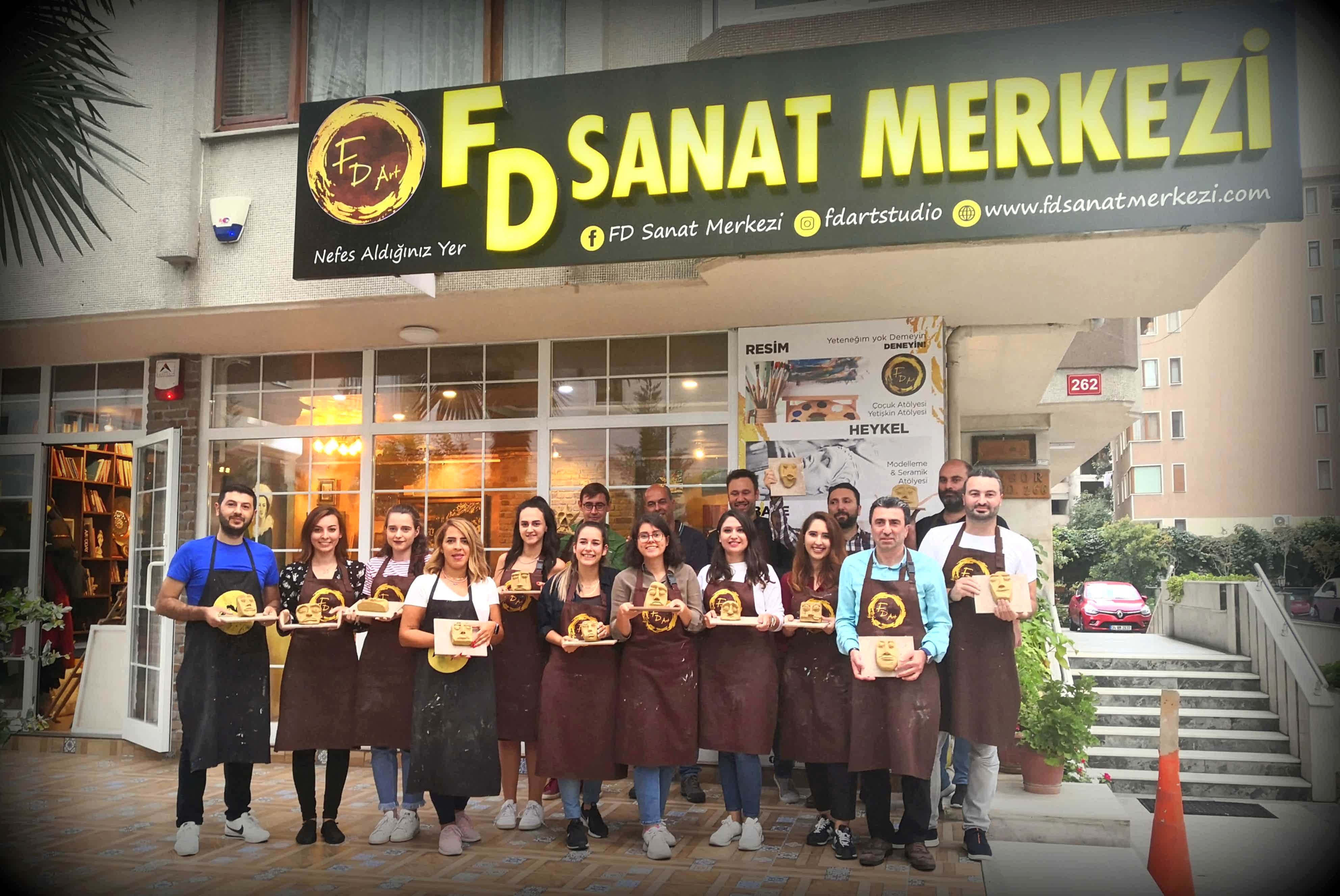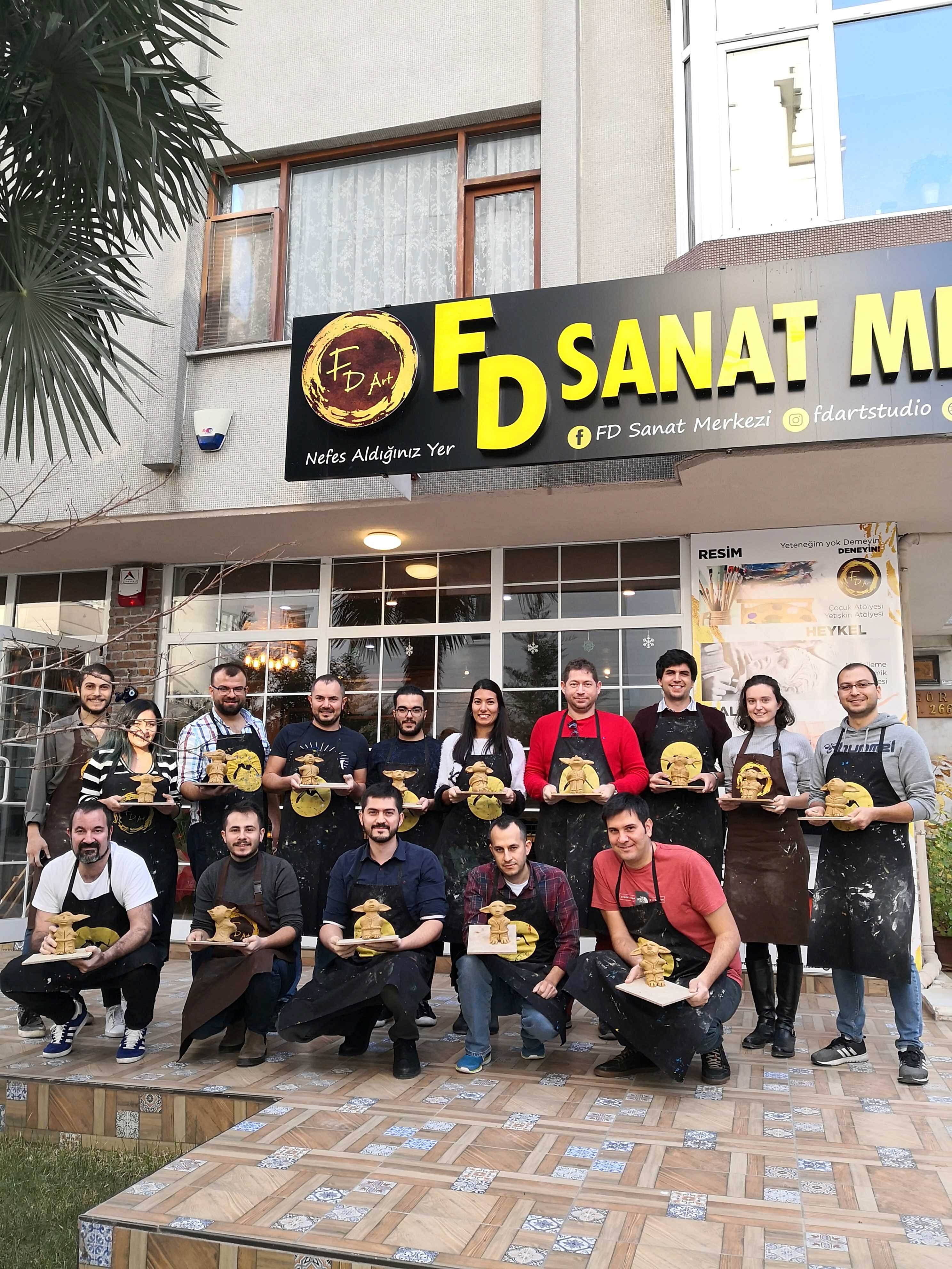 FD Sanat Merkezi Heykel workshoplarında her katılımcı harika bir deneyimle mutlu, deşarj olmuş, kafasını boşalmış ve eli başarılı eseriyle dolu ayrılır. Nasıl mı? Öncelikle seansı yöneten heykeltıraşımız süre yönetimi ve işin en eğlenceli kısmı sizlere kalsın diye workshop öncesi seçerek geldiğiniz konu malzemelerini hazırlamış, modelaj kalemleriniz ve önlüklerinizle sizi beklerken, sizler sadece yiyecek ve içeceklerinizle belirlenen saatte atölyemizde bulunarak serüvene başlıyorsunuz. Heykeltıraşımızın detaylı anlatımıyla keyifli müzikler eşliğinde aşamalandırarak adım adım yönlendirmesi ile kendi yorumlarınızı da katarak keyifli sohbetler eşliğinde çalışmalarınızı tamamlıyorsuz. Bu etkinlikte katılımcılarımız yaratıcılıklarını kullanarak kile şekil verirken bir yandan da çamurla terapi tadında rahatlama ile unutamayacakları bir deneyim yaşar. Yetenekli ya da deneyimli olmaya gerek yok. Bu harika deneyimde önemli olan keyif almak ve sosyalleşerek güzel vakit geçirmek. Etkinlik sonrası final fotoğrafları ile her bir katılımcının kendi elleri ile yaptığı eseri sergilenmeye hatta kullandığımız özel kil sayesinde fırınlanmaya ihtiyaç duymadan havayla teneffüs ederek 1 hafta içinde kuruyacağından renklendirilerek ev veya ofisinizde kullanılmaya hazır olacak. Keyifli bir heykel atölyesi deneyimine hazır olun!