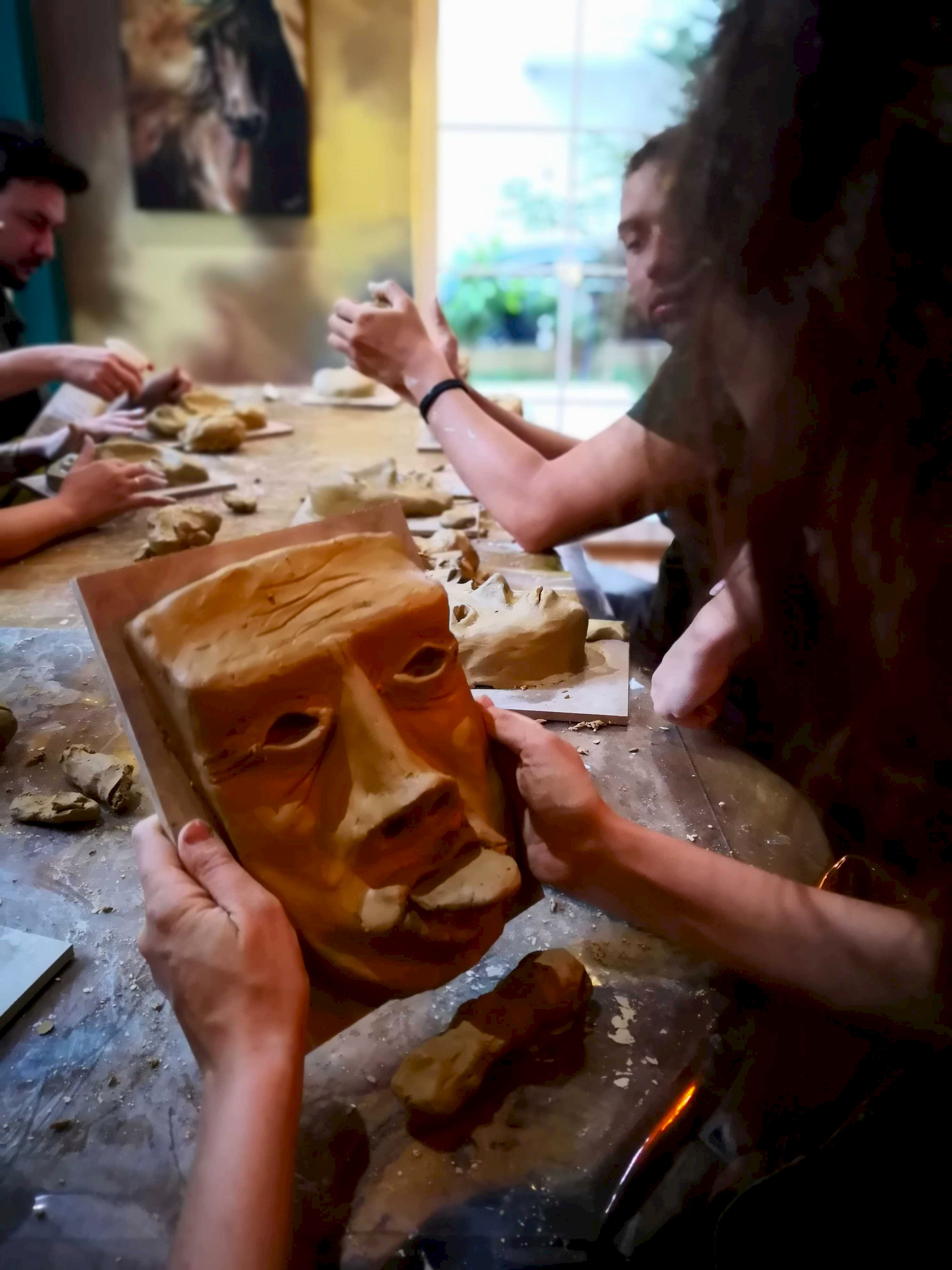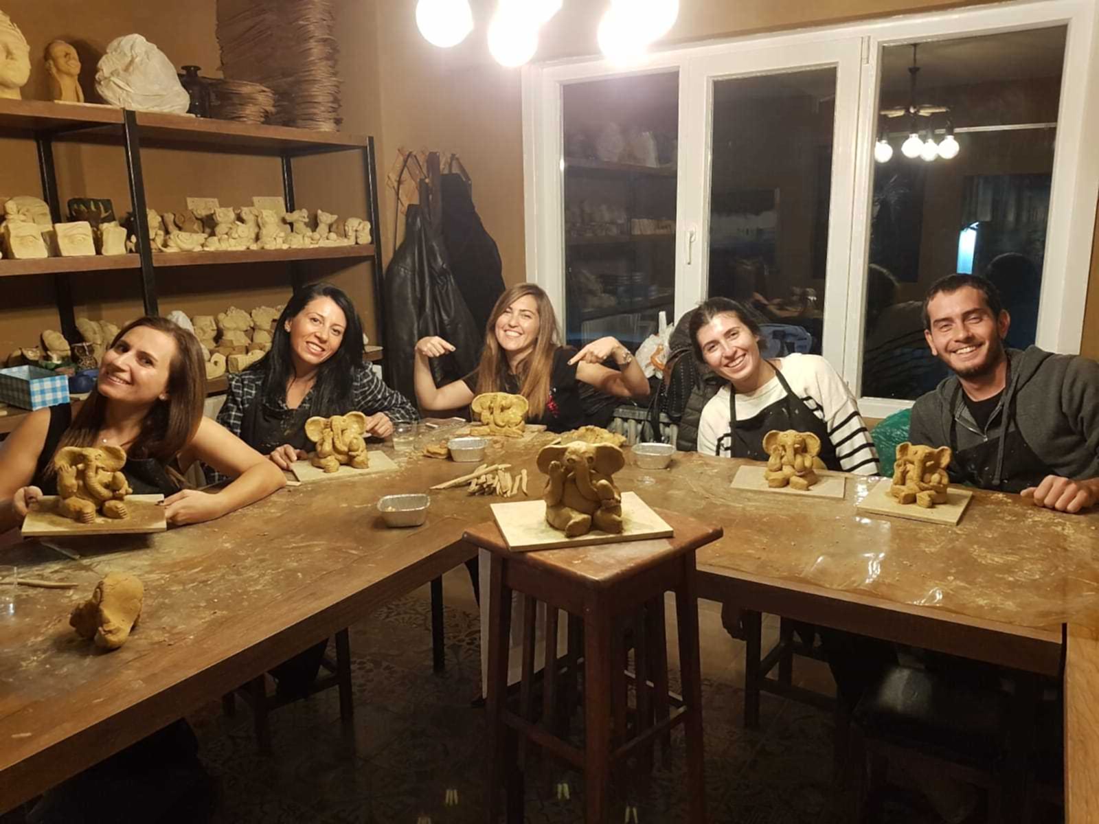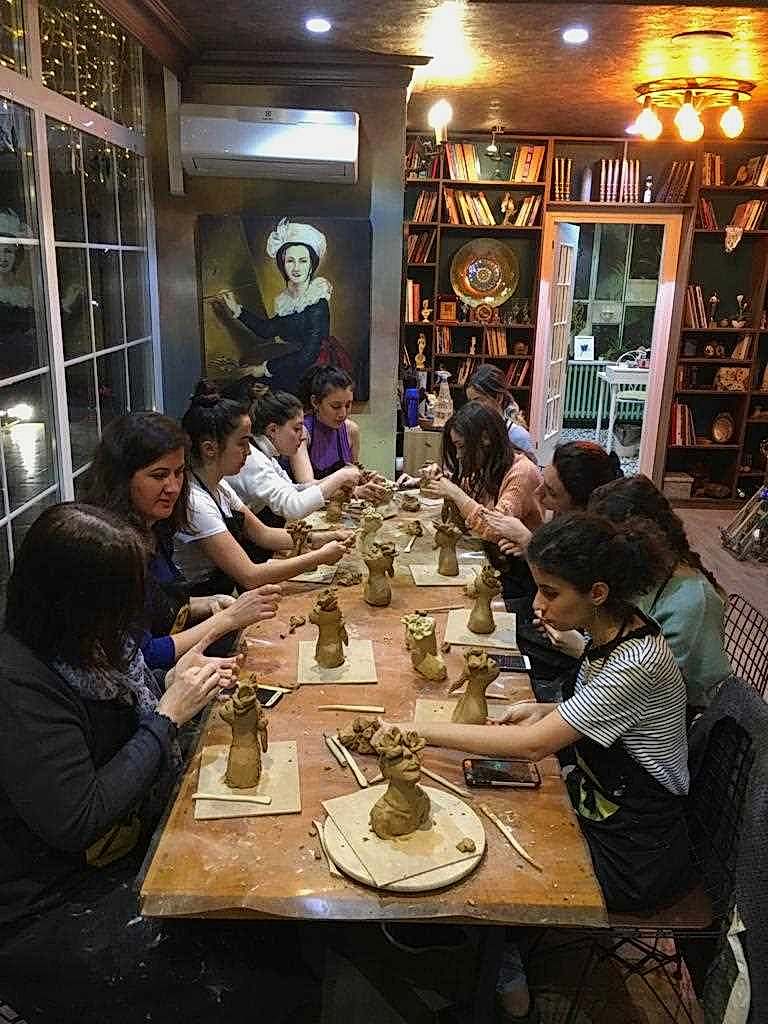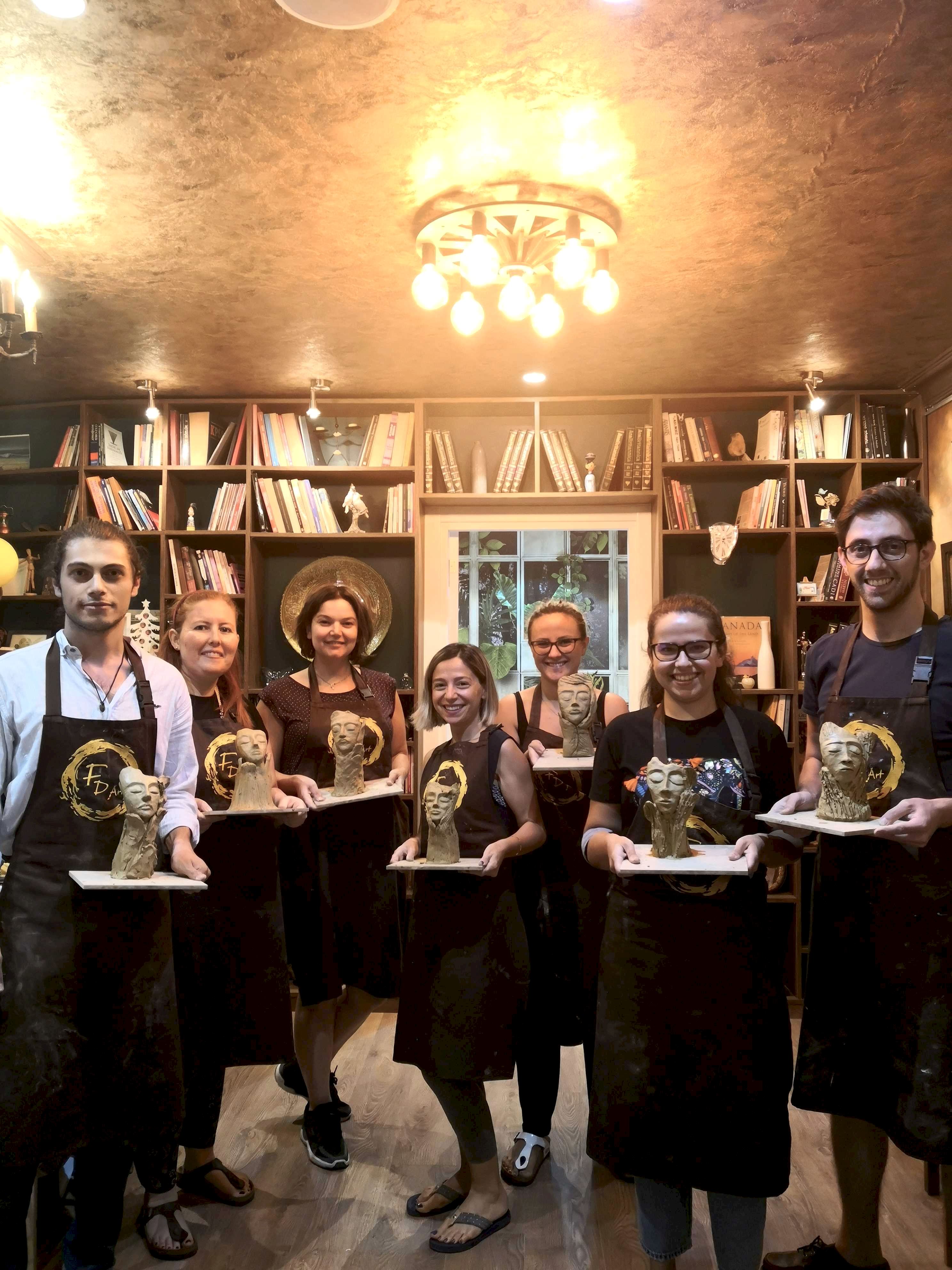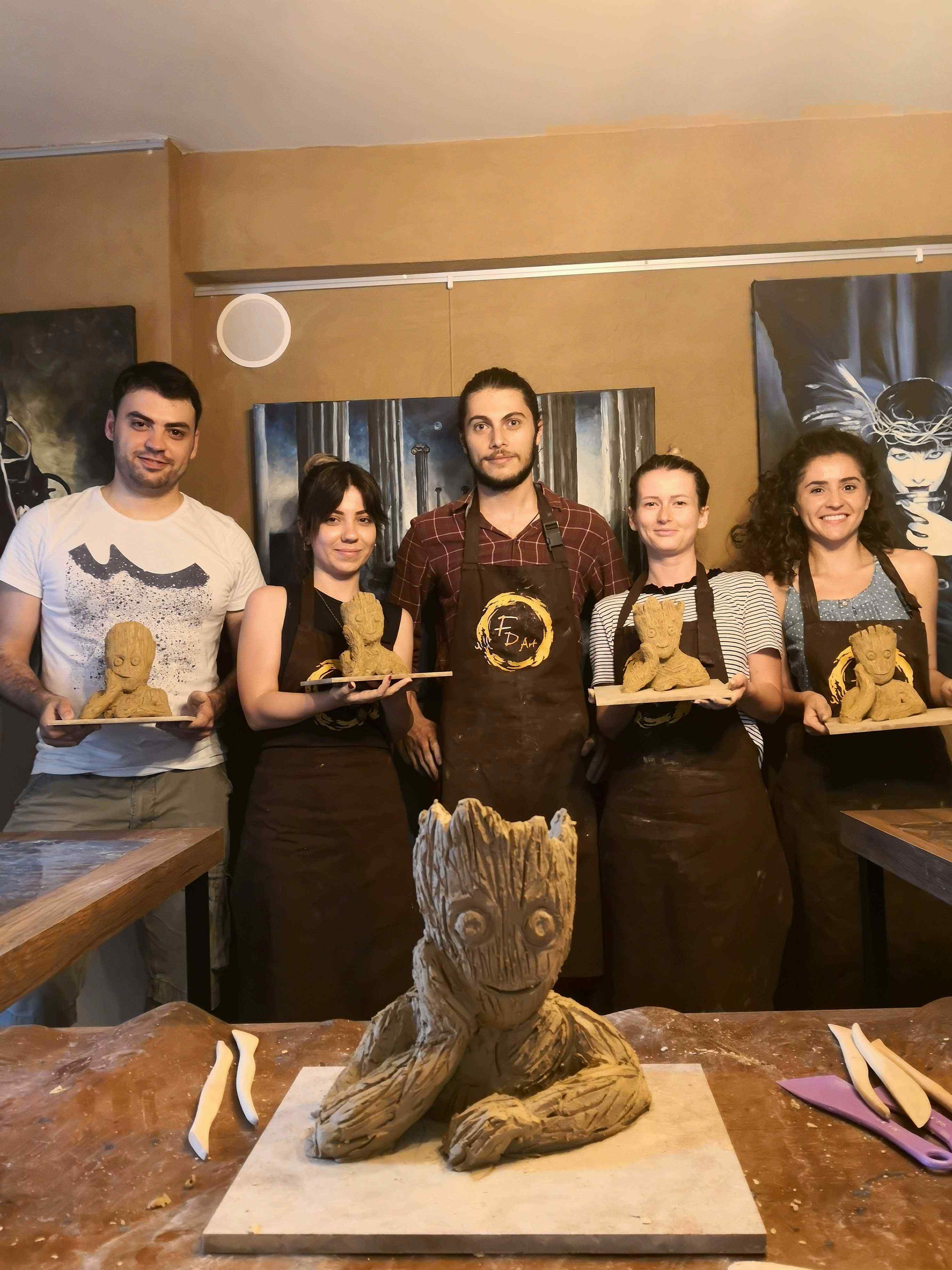 FD Sanat Merkezi Heykel workshoplarında her katılımcı harika bir deneyimle mutlu, deşarj olmuş, kafasını boşalmış ve eli başarılı eseriyle dolu ayrılır. Nasıl mı? Öncelikle seansı yöneten heykeltıraşımız süre yönetimi ve işin en eğlenceli kısmı sizlere kalsın diye workshop öncesi seçerek geldiğiniz konu malzemelerini hazırlamış, modelaj kalemleriniz ve önlüklerinizle sizi beklerken, sizler sadece yiyecek ve içeceklerinizle belirlenen saatte atölyemizde bulunarak serüvene başlıyorsunuz. Heykeltıraşımızın detaylı anlatımıyla keyifli müzikler eşliğinde aşamalandırarak adım adım yönlendirmesi ile kendi yorumlarınızı da katarak keyifli sohbetler eşliğinde çalışmalarınızı tamamlıyorsuz. Bu etkinlikte katılımcılarımız yaratıcılıklarını kullanarak kile şekil verirken bir yandan da çamurla terapi tadında rahatlama ile unutamayacakları bir deneyim yaşar. Yetenekli ya da deneyimli olmaya gerek yok. Bu harika deneyimde önemli olan keyif almak ve sosyalleşerek güzel vakit geçirmek. Etkinlik sonrası final fotoğrafları ile her bir katılımcının kendi elleri ile yaptığı eseri sergilenmeye hatta kullandığımız özel kil sayesinde fırınlanmaya ihtiyaç duymadan havayla teneffüs ederek 1 hafta içinde kuruyacağından renklendirilerek ev veya ofisinizde kullanılmaya hazır olacak. Keyifli bir heykel atölyesi deneyimine hazır olun!