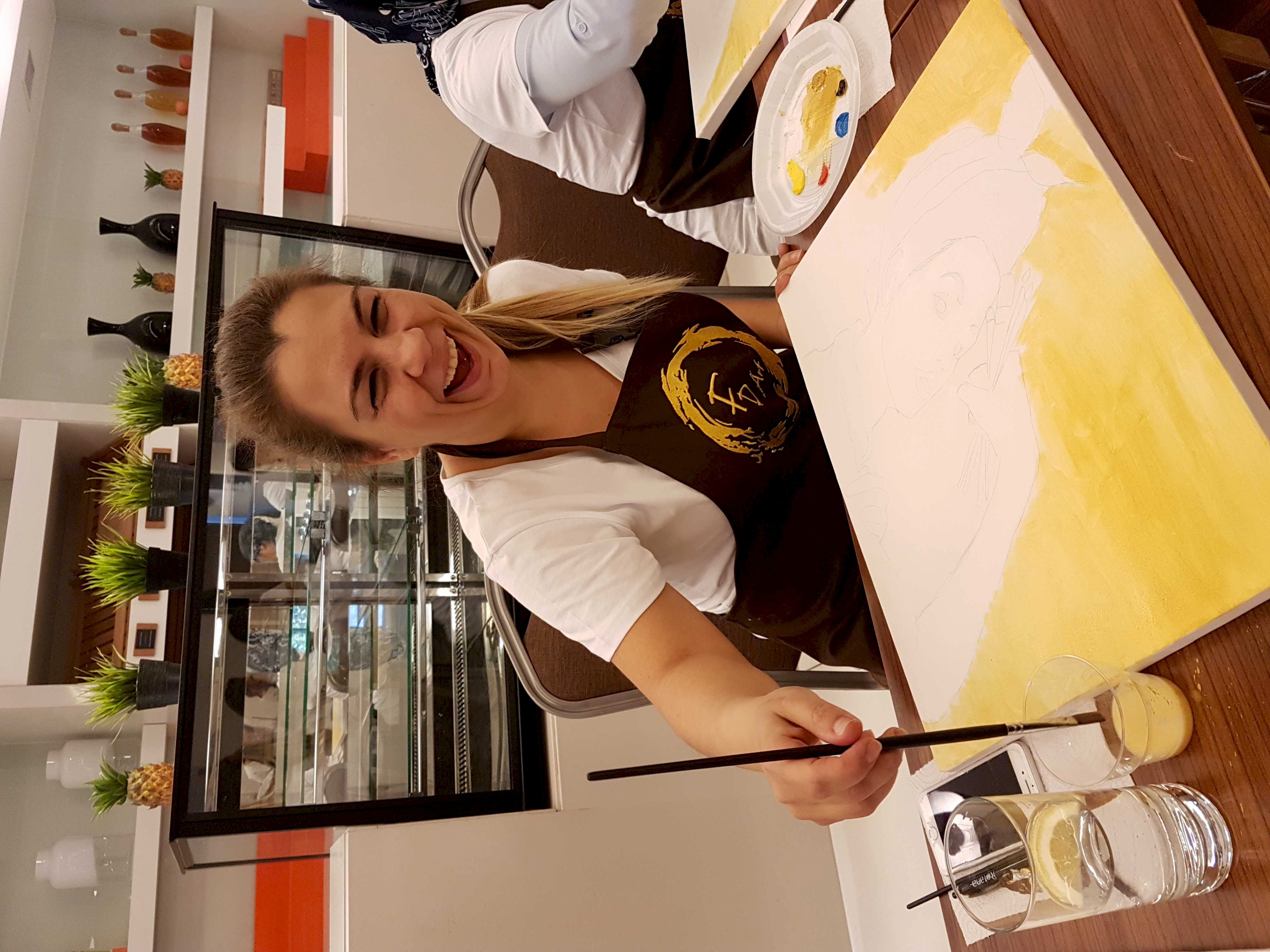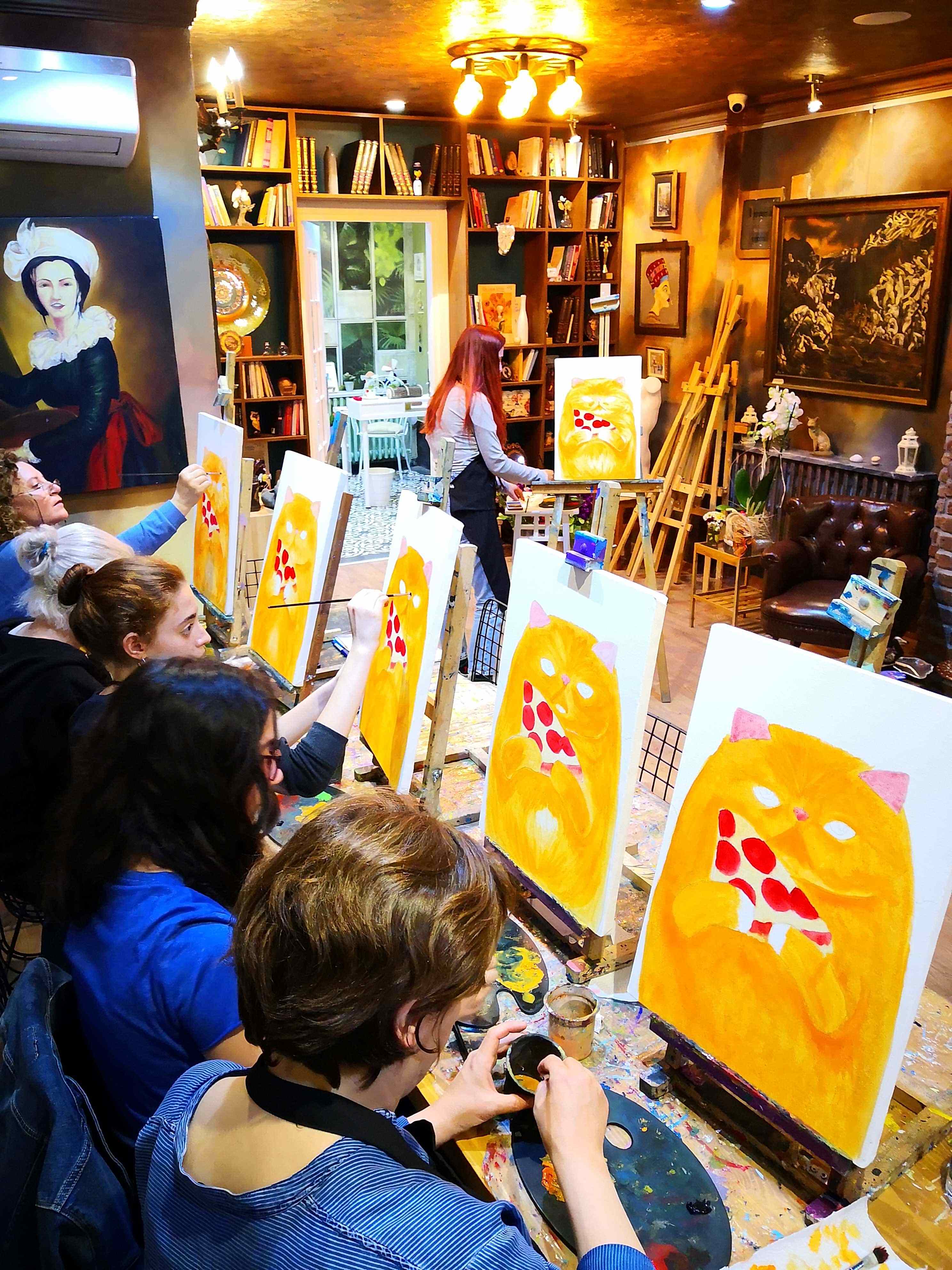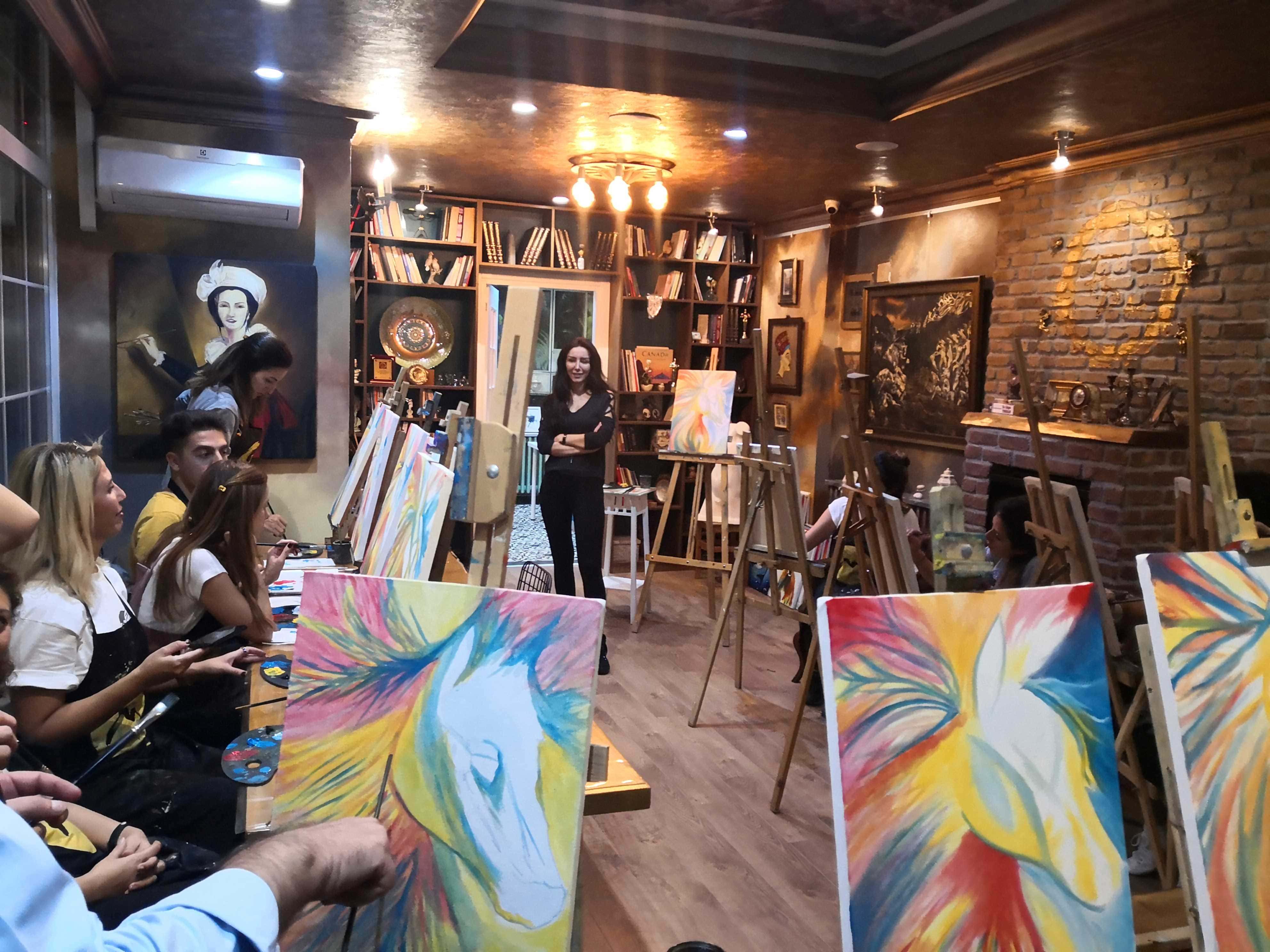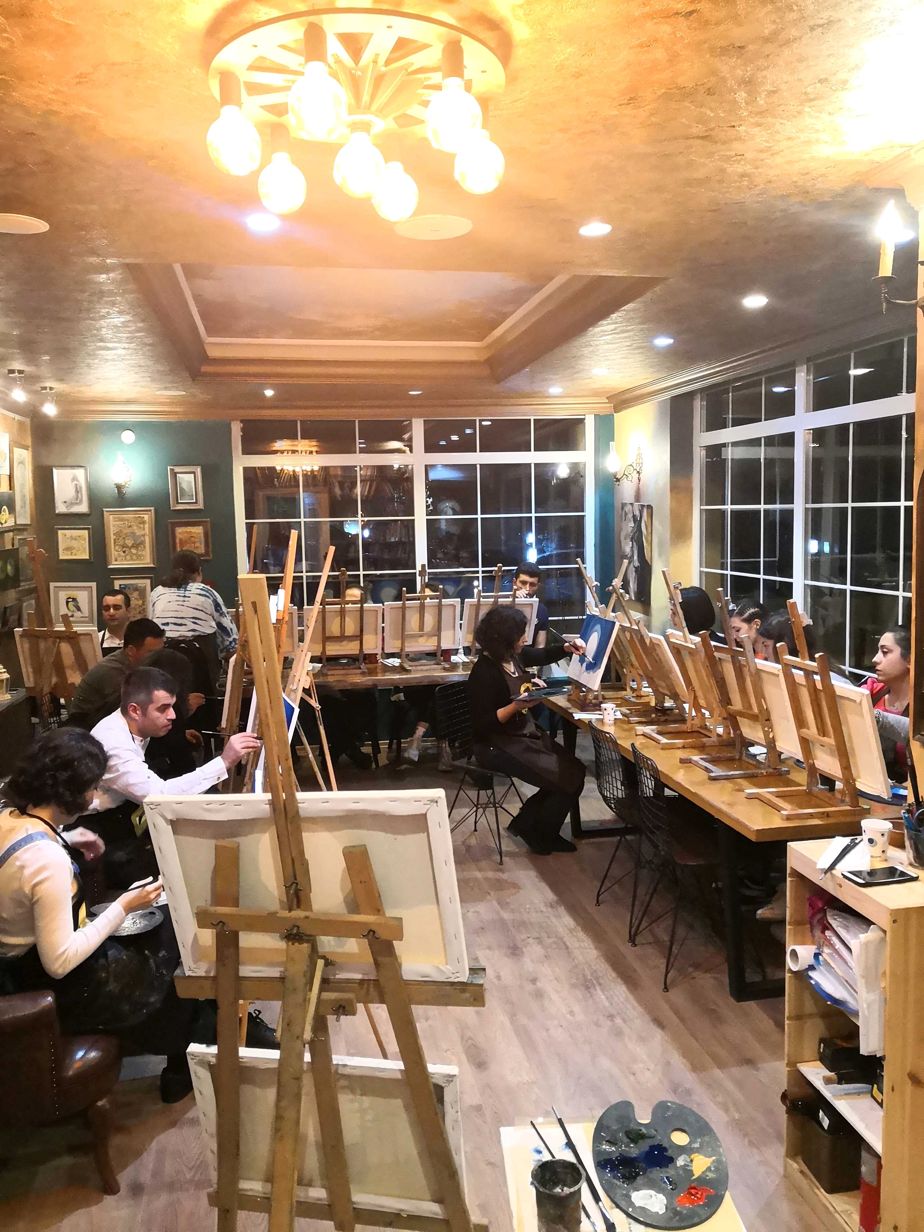 Öncelikle seansı yöneten ressamımız süre yönetimi ve işin en eğlenceli kısmı sizlere kalsın diye workshop öncesi seçerek geldiğiniz konu taslağını tuvalinize çizmiş, palet ve boyalarınızı hazırlamış, fırça ve önlüklerinizle sizi beklerken, sizler sadece yiyecek ve içeceklerinizle belirlenen saatte atölyemizde bulunarak serüvene başlıyorsunuz. Ressamımızın detaylı anlatımıyla keyifli müzikler eşliğinde aşamalandırarak adım adım yönlendirmesi ile kendi yorumlarınızı da katarak keyifli sohbetler eşliğinde çalışmalarınızı tamamlıyorsuz.